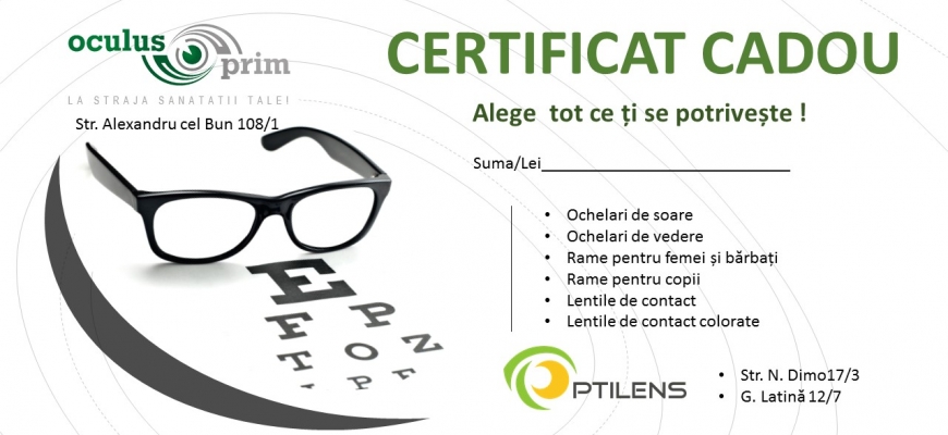 Certificat Cadou poate fi achiziționat la optica Optilens sau CM OculusPrim și este valabil la o singură cumpărătură. Certificatul este transferabil și valabil doar cu bonul de casă anexat . Acest Certificat poate fi folosit ca metodă de plată în oricare din optici Optilens sau CM OculusPrim . Certificat Cadou nu este returnabil.